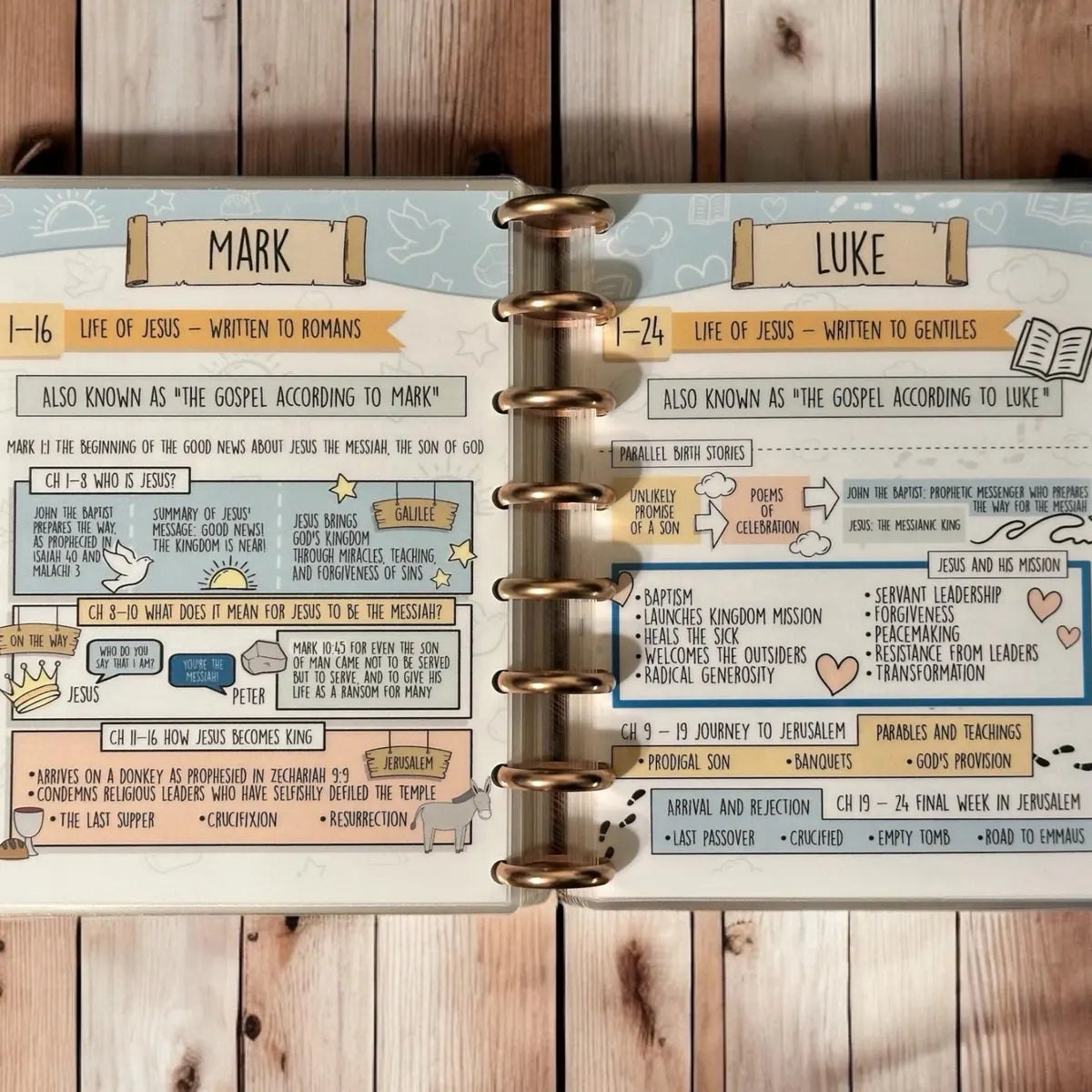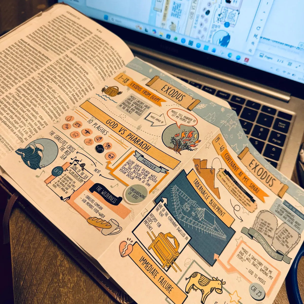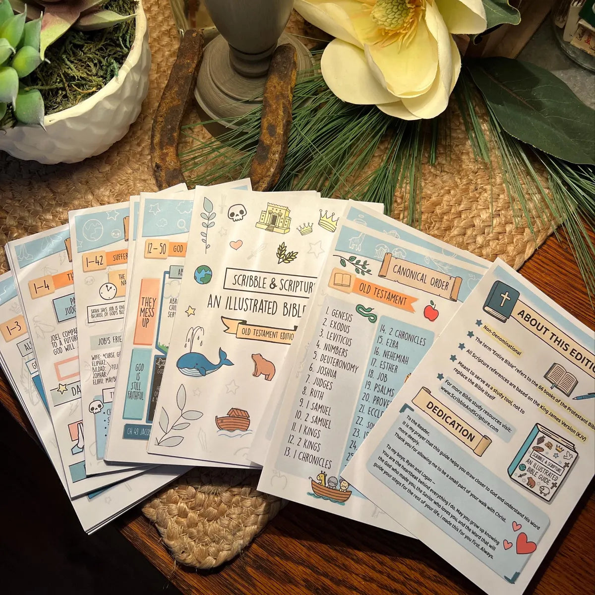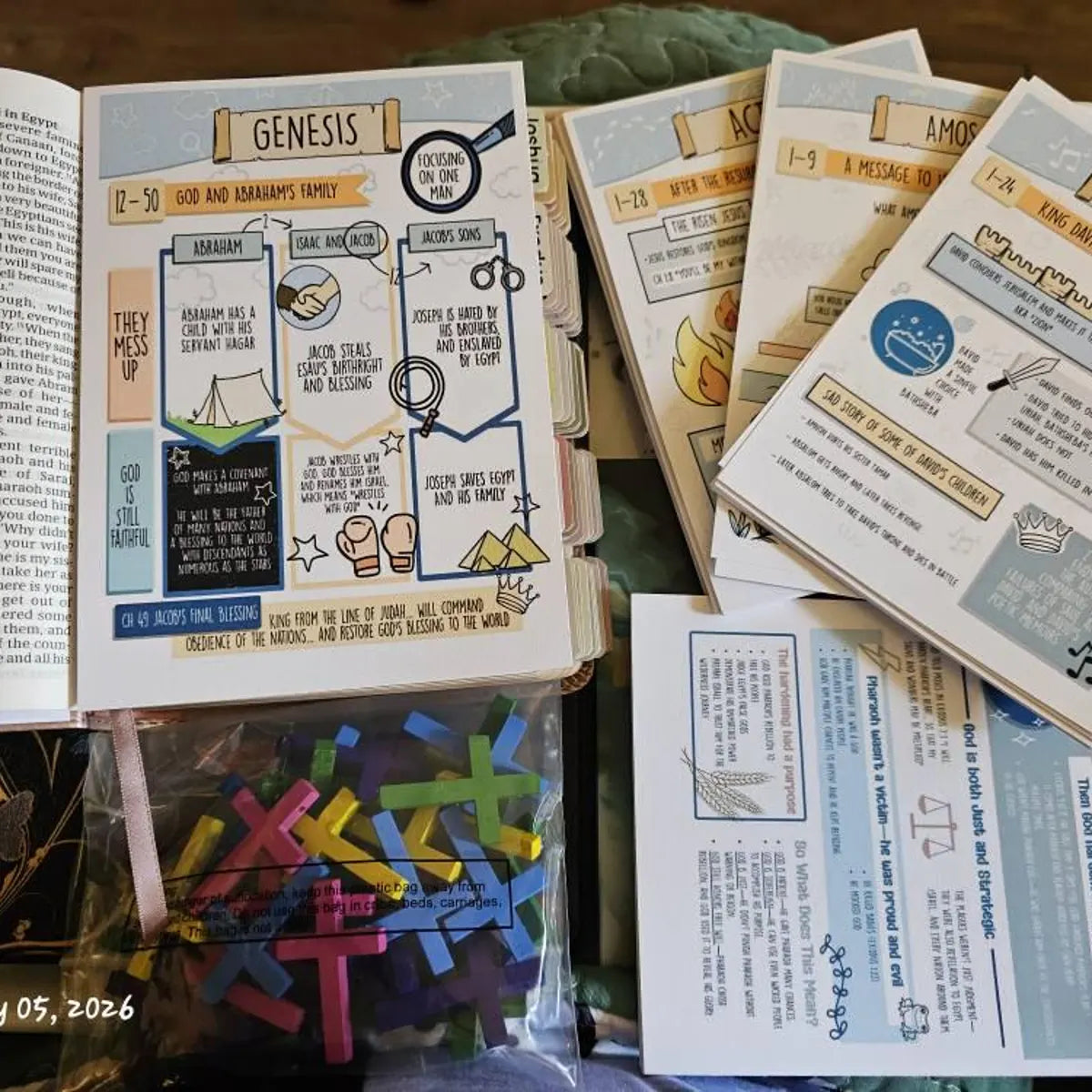 A: Study Bibles bury helpful notes in tiny font at the bottom of the page. Commentaries require you to stop reading and pick up a separate book. These tip-ins give you the big picture at a glance—right where you need it, right when you need it. One page. Visual. Simple. You'll actually use them.